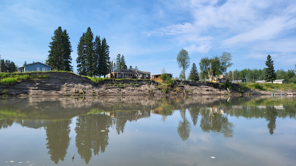 Flood inundation maps indicated that a significant portion of the community is subject to some amount of inundation, which is consistent with community observations. The flood assessment included an erosion assessment of the riverbank, which revealed an approximate erosion rate of 1.0 meter per year, which is important to consider in planning and mitigation considerations. The community has already implemented proactive measures such as minimum building heights and new construction on higher ground.
