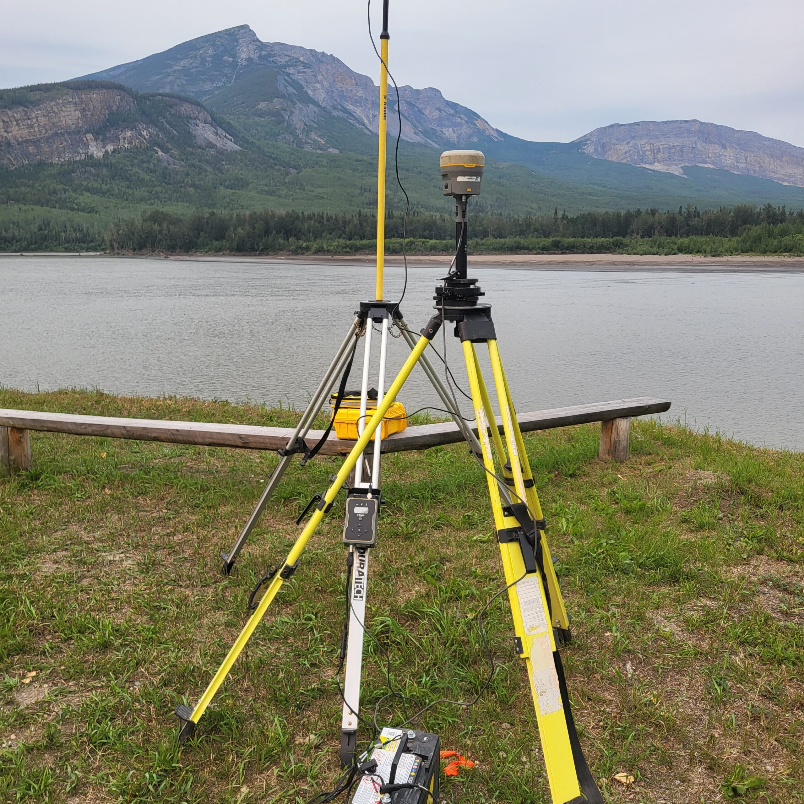 This project was informed by a blend of local knowledge, extensive data collection, and technical assessments. Community engagement, including input from Traditional Knowledge holders and observations from community members, provided insights into historical flooding and erosion patterns. A community-led monitoring program involved weekly visual assessments of shoreline changes on the South Nahanni River, contributing to a detailed understanding of water level fluctuations. Desktop data collection encompassed existing geospatial data and analysis of historical hydrometric data from regional stations. On-site observations were completed in 2024 to understand the bathymetry of the South Nahanni and Liard rivers, surveying 15 linear km of river bathymetry. A drone survey further enhanced Dillon’s topographic understanding of the community and nearshore area, which had become exposed due to low water levels at the time.
